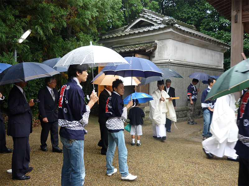 雨の中神主さんが蔵へ向かいます。