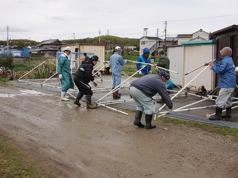 テントの組立は共同作業です。