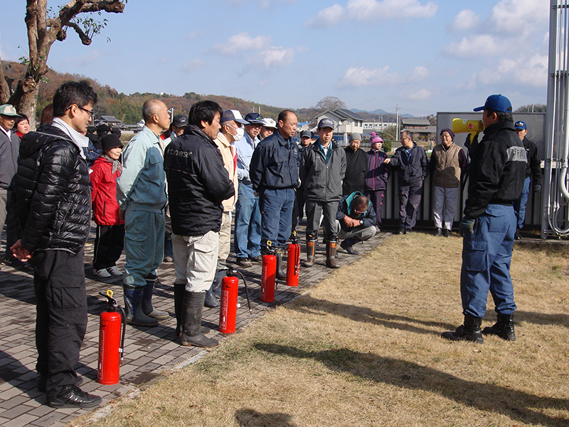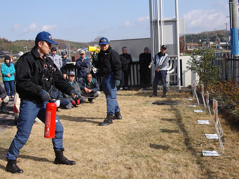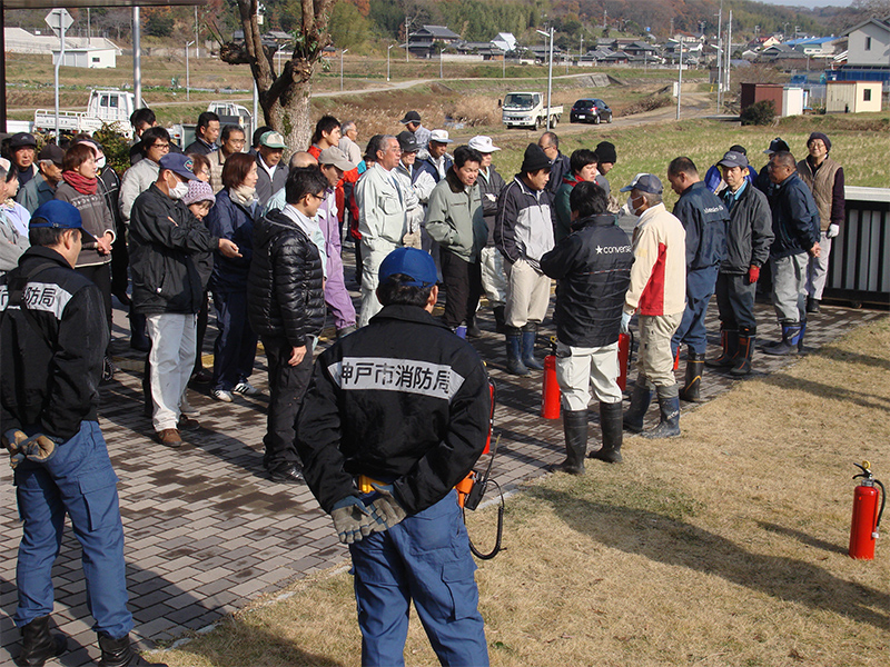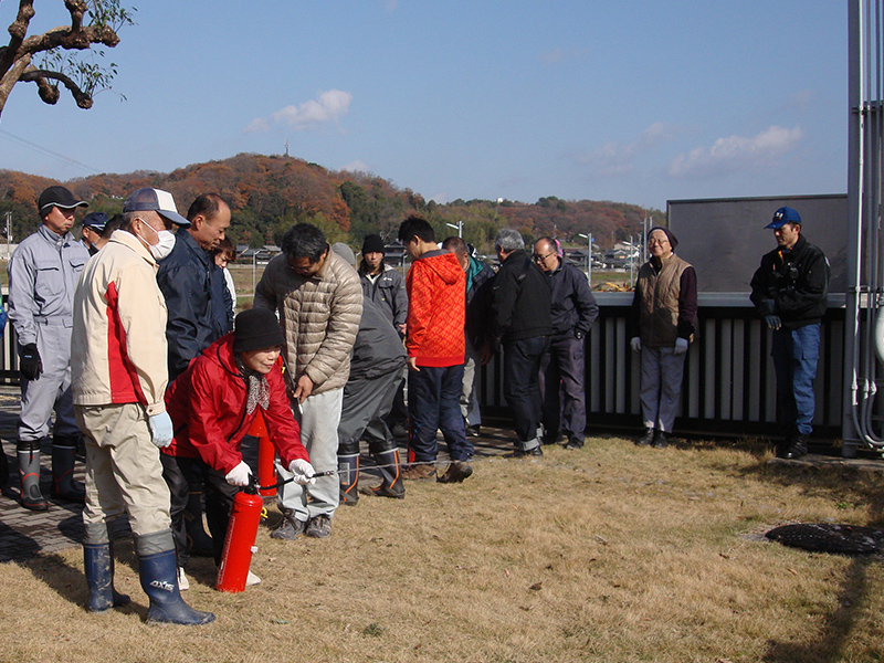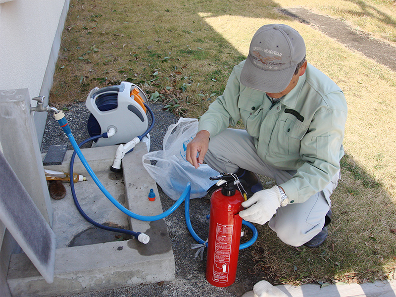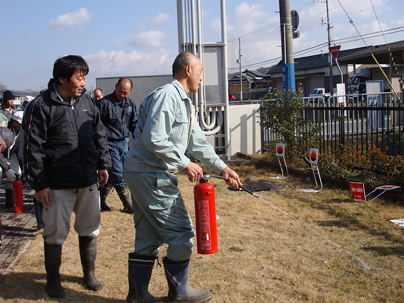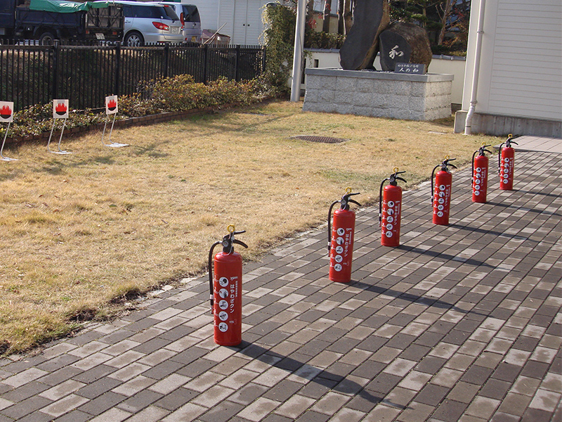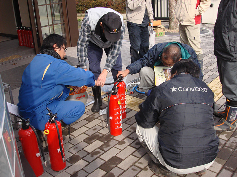 写真:福谷会館にて 消火器による消火訓練が行われました。西消防署の指導の下全員が熱心に取り組んでいました。