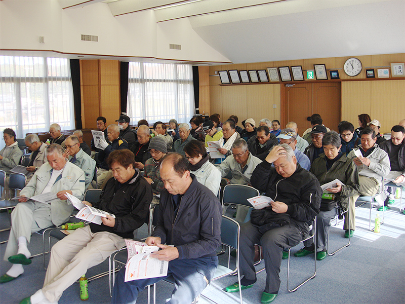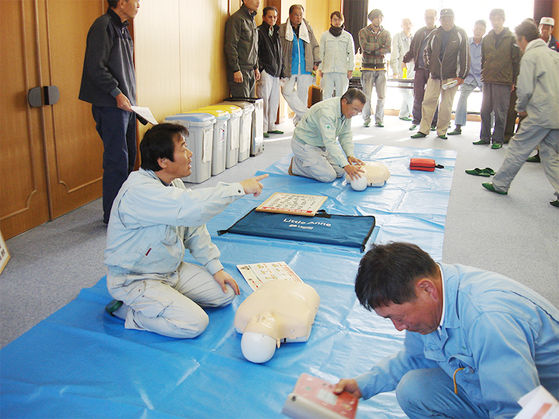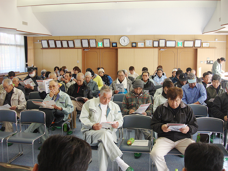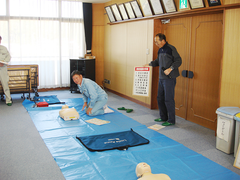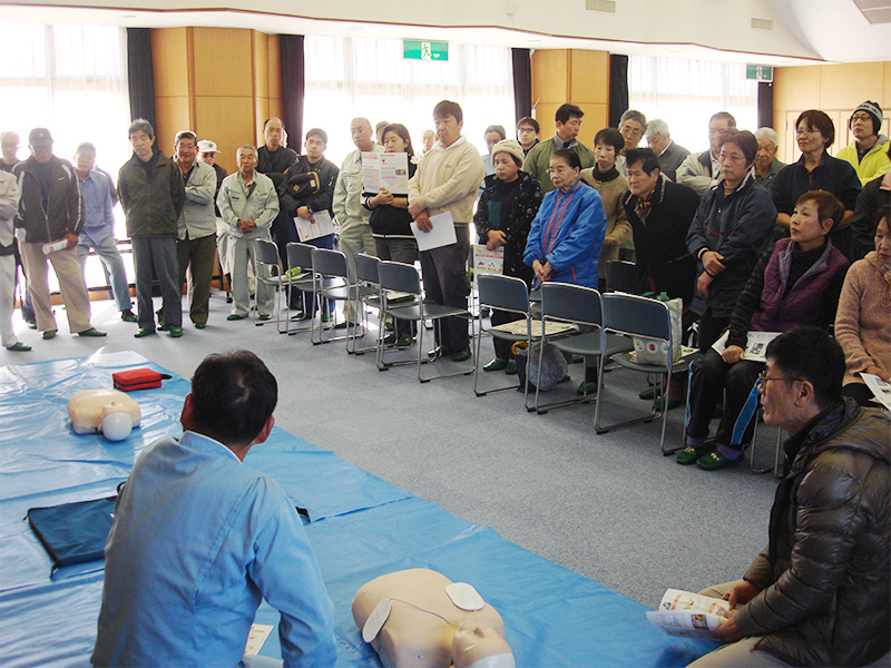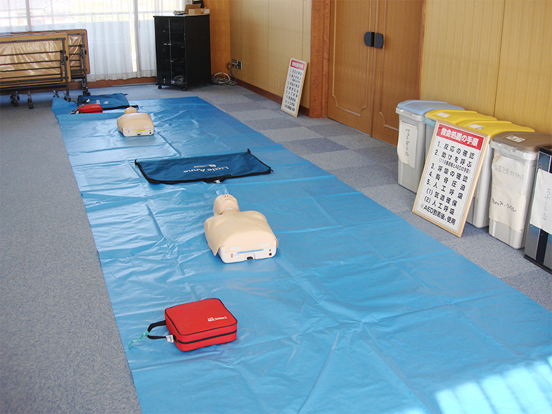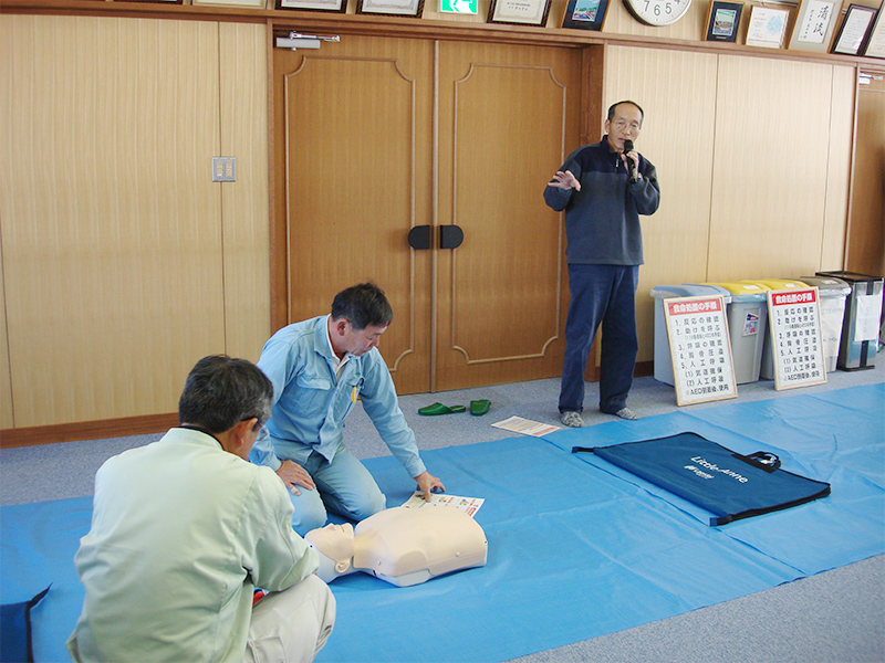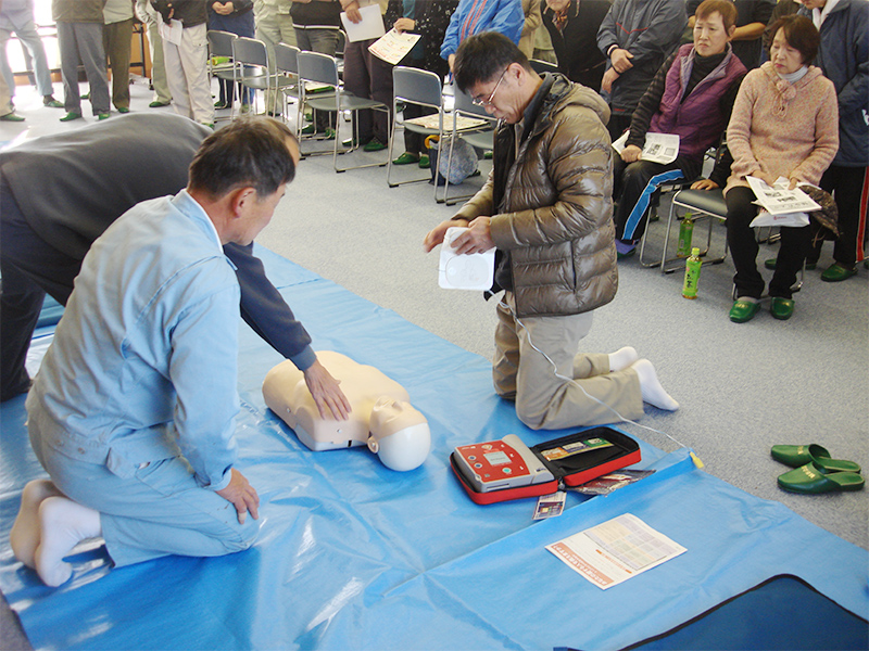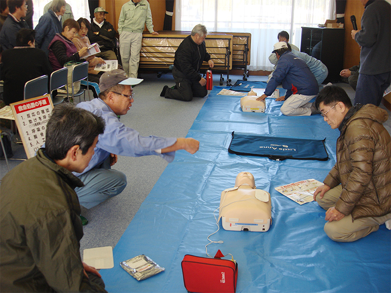 集落全員参加でAEDによる救急救命の講習が行われました。本当に起こると一刻を争うことだけに、全員真剣に取り組んでいました。