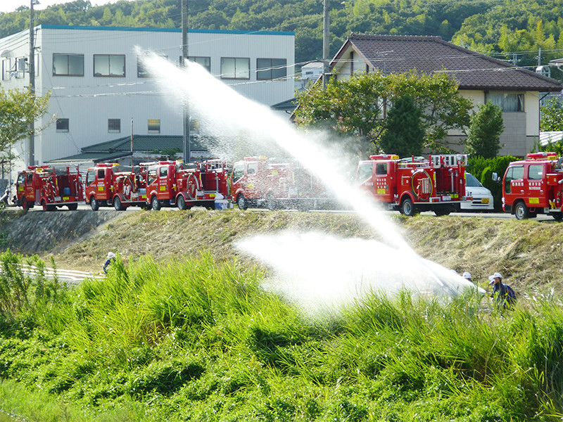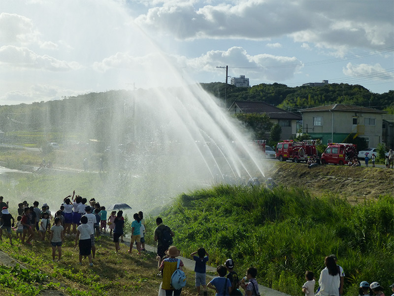 最終プログラムは、これも恒例、地元消防団の一斉放水です。放水開始!