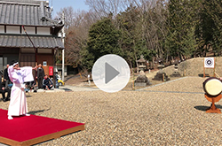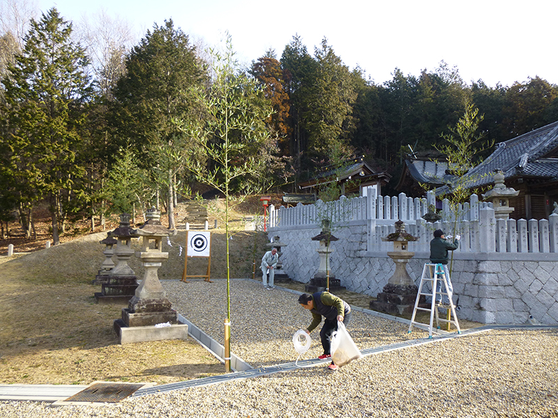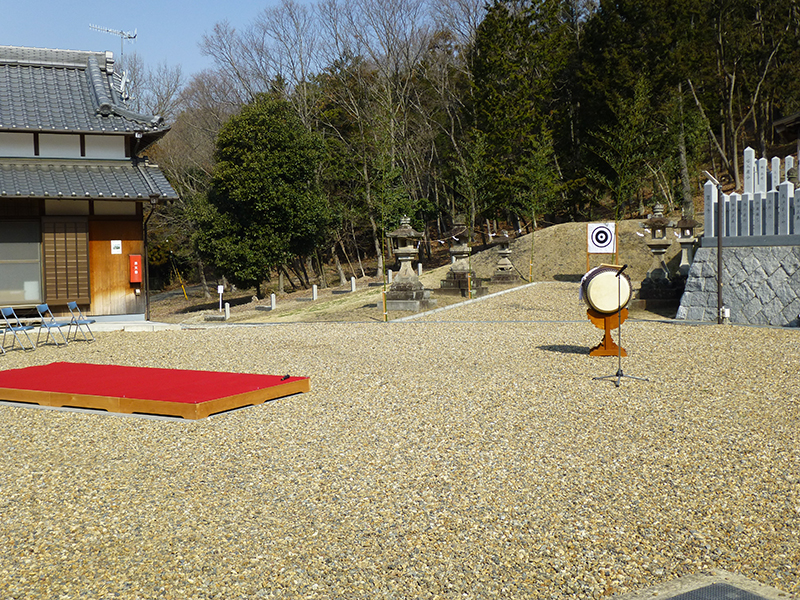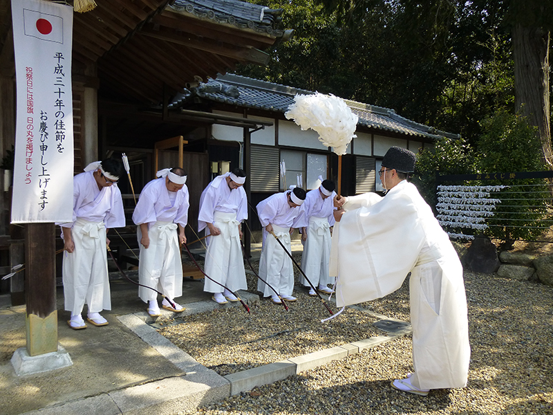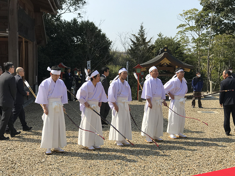 雲ひとつない青空の中、祈年祭・弓引き祭神事の始まりです。