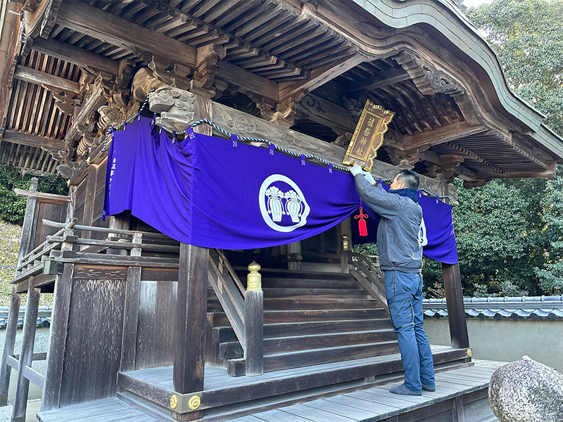 本殿の幕を張ります。