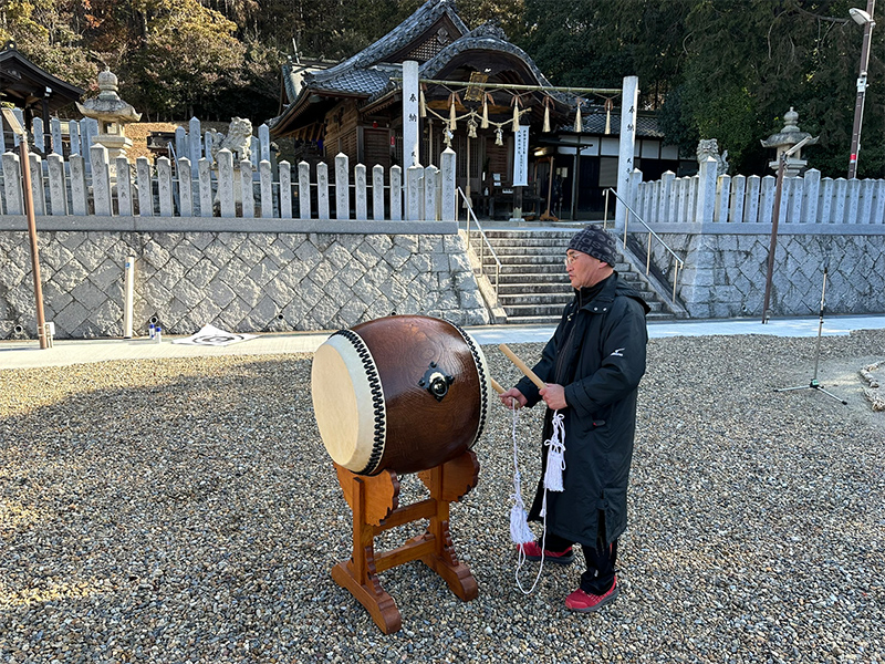 的を射抜いた時を知らせる、太鼓を準備しています。