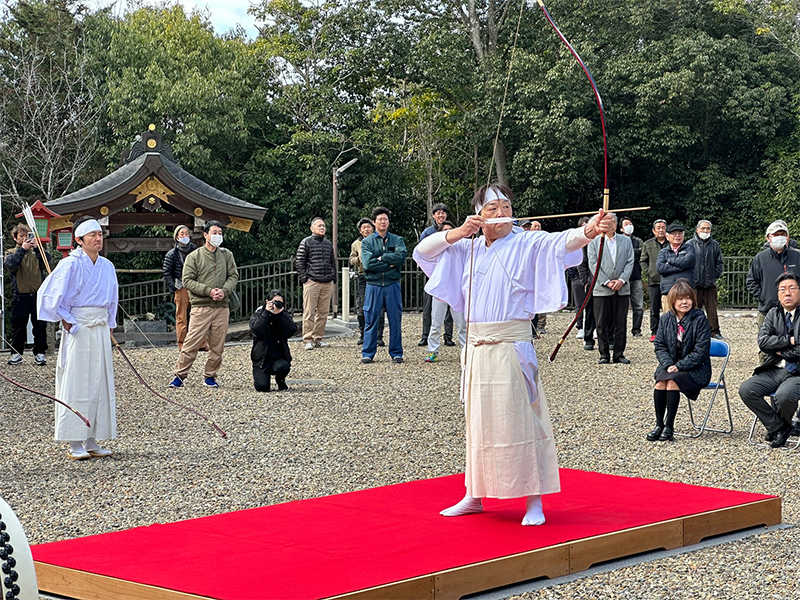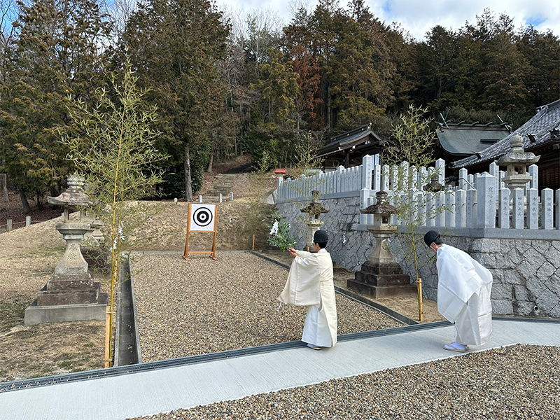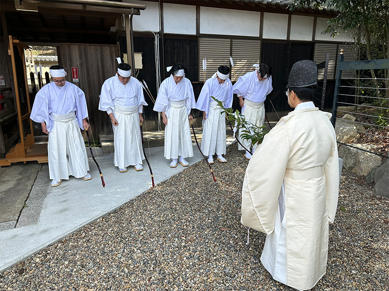 拝殿での神事を終えて、射手が弓矢を手にします。