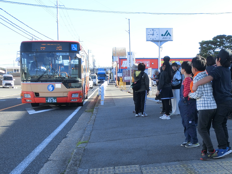 バスが到着、気をつけて乗りましょう。